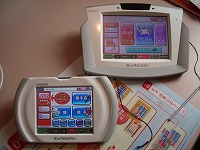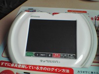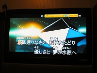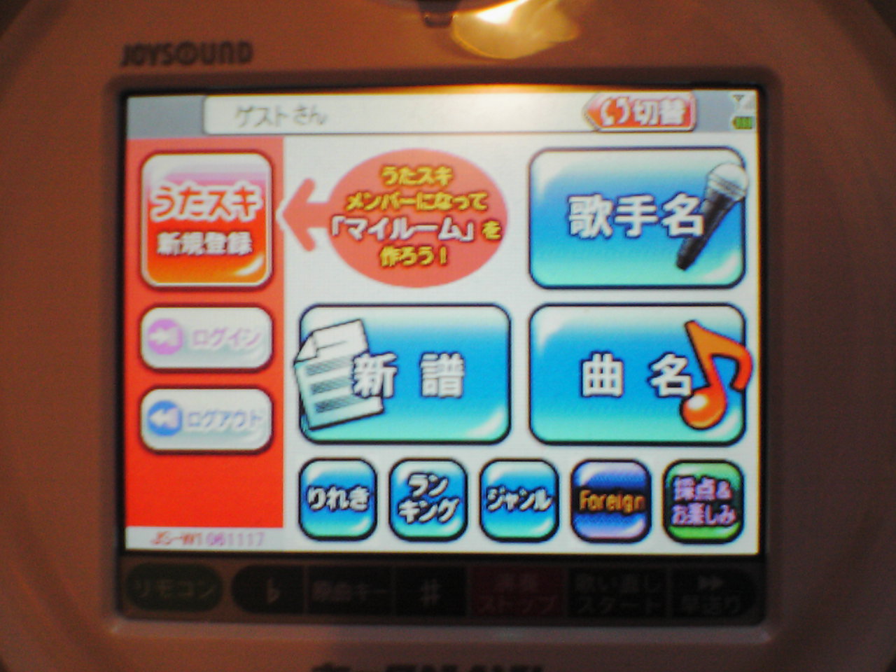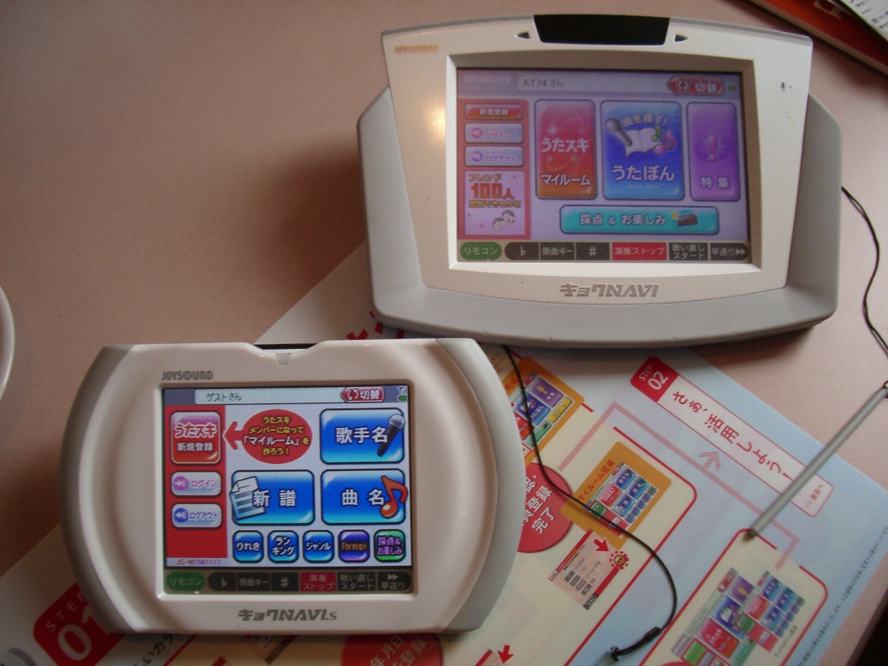 本体 まずは本体のレポートからです。 左は正面の写真。専用?のアンプの上にスタイリッシュな本体。やはり液晶はどこにもありません。ボタンはエコーレベル、音量のみ。キーやテンポはキョクNAVIから操作します。右の写真は、斜めから写したもの。表面は波打ったような凹凸。これがWAVEの名前の由来ということなんですかね。 ディスプレイも含めた全体写真。何曲か歌ったところで突如ブルーバックしたときの物です。カラオケで本体がフリーズするのを見たのは初めて。これはたまたまなのか、それとも良くあることなのか・・・。再起動の貴重な場面を見ることが出来ました。 音と映像は心なしか綺麗になっている気はしました。こればかりはカラオケ屋の環境にもよるので何とも言えませんが。 端末(リモコン) Joy WAVEには所謂今までのリモコンは付いておらず、キョクNAVIとその小型版のキョクNAVI .sが1台ずつ付属していました。 今回のWAVEではこういった端末で全ての操作が出来ることをコンセプトにしているようです。 新型のキョクNAVIは機械的な大きな変更は見られないものの、本体にあったUSB端子などが無くなっています。あと、動作が初代キョクNAVIに比べてかなり遅くなっています。多機能化の影響なのか解りませんが、レスポンスの速さがキョクNAVIで気に入っていた点なので少々残念です。 対してキョクNAVI.sはカラー液晶ながら、解像度は初代デンモク程度。ただ、動作はかなり軽快です。うたスキの機能に制限はあるものの、カラオケ用のリモコンとしてはこちらの方が優秀だと思います。DAMステやUGA navi+と比べても快適な操作性ですね。 採点機能 Joy WAVEではDAMで言う「ランキングバトル」に相当する「全国採点ON LINE」が加わりました。他には「いきなり採点」「チャレンジ」があります。「分析採点」はまだ導入されてないのか、使えませんでした。ここでは全国採点に絞ってレポートいたします。 左の写真は全国採点をONにしたときの画面。画面右上に採点バーが出て、DAMのランバト同様に現在の最高点と、自分の大体の順位が表示されます。ただ、情報量はランバトよりも少ないです。DAMの場合は10位以内になると現在の自分の順位が1位ごとに報告されますが、JOYでは5位ごとにしか報告されません。また、DAMが3位の人までの名前と得点が見られるのに対し、JOYは1位の人の名前と得点しか解りません。もう少し充実を図って欲しいところです。 右の写真はキョクNAVIでの、自分の成績確認画面。「うた年齢」「全国うたランキング」「ベストスコア」を参照できます。うた年齢の算出のファクターは良く解りませんが、全国うたランキングについては大体の感触がつかめたので以下に覚書をしておきます。 「全国うたランキング」は曲ごとのランキングではなく、歌っている人のランキングです。その人が歌った曲の数々の情報から総合的にその人の順位を決定してるようです。まだまだWAVEの機種自体が出回ってないのではっきりとは解りませんが、上位にランクされるには大体以下の法則があるようです。